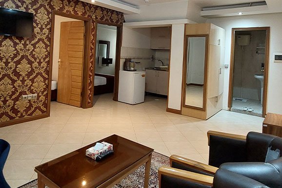 امکانات اتاق: شامل تلویزیون، یخچال، کتری برقی، مبلمان، کمد لباس و دراور برای راحتی و آسایش مهمانان.