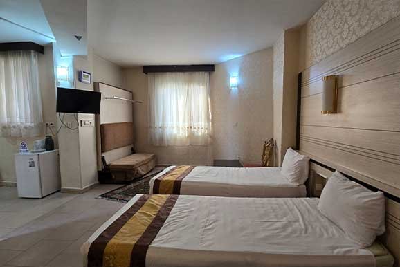 اتاق‌های سه تخته تا هفت تخته هتل آریا مشهد با امکاناتی همچون یخچال، تلویزیون، کمد لباس، تلفن داخلی و پک بهداشتی تجهیز شده‌اند تا مهمانان اقامتی راحت و آسوده را تجربه کنند. هتل دو ستاره آریا مشهد با بیش از دو دهه میزبانی از زائران حرم مطهر رضوی، به‌عنوان یکی از گزینه‌های محبوب و باسابقه در صنعت هتلداری مشهد شناخته می‌شود. موقعیت استثنایی این هتل و قرارگیری در نزدیکی حرم مطهر، دسترسی آسان به اماکن زیارتی و تجاری را برای شما فراهم می‌کند. با رزرو هتل آریا مشهد، می‌توانید با صرف کمترین زمان به زیارت حرم مطهر مشرف شوید و از سفر معنوی خود نهایت لذت را ببرید. این هتل که در سال ۱۳۹۴ به طور کامل بازسازی شده است، با ارائه خدماتی باکیفیت و فضایی آرام و دلنشین، اقامتی خاطره‌انگیز را برای شما رقم خواهد زد.